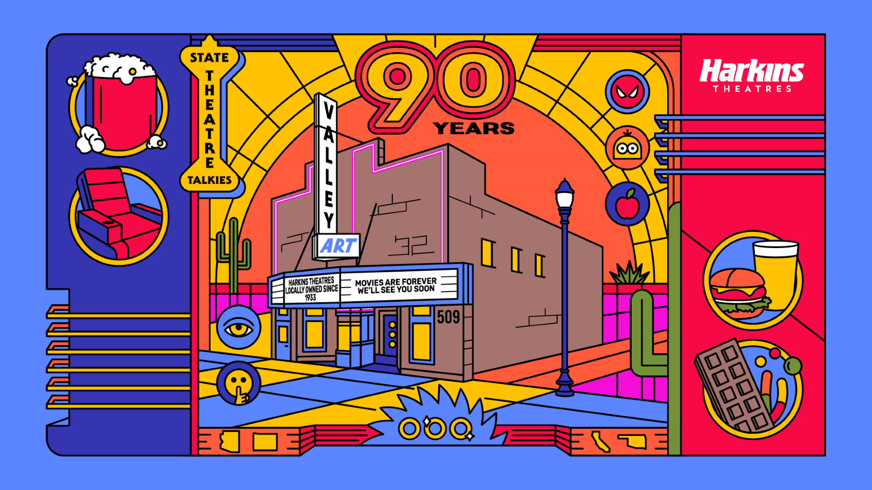 Harkins Theatres approached us to design a commemorative cup for their 90-year anniversary, celebrating their legacy as the Ultimate Moviegoing Experience. We crafted a concept that put the historic Harkins Valley Art, their longest-standing location, at the forefront. Using a retro aesthetic, the design wove together hidden elements and Easter eggs to honor Harkins’ storied past and its beloved features. Our approach highlighted key aspects that have defined the brand over the decades, including award-winning popcorn, luxurious Ultimate Loungers, and a diverse range of food and snacks, all while incorporating Arizona-inspired motifs that pay homage to Harkins' origins.
